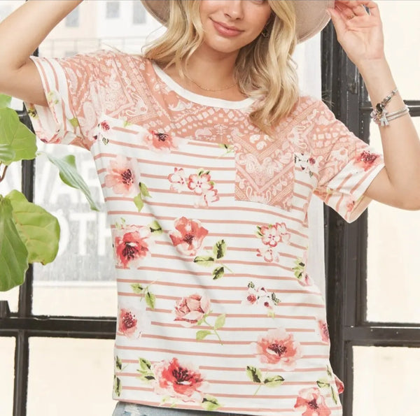 The Floral Pocket Tee features a peach and white striped design complemented by a floral print, crafted for versatility and style. The combination of colors and patterns enhances its visual appeal, making it suitable for various casual settings. The fabric offers comfort, ensuring a pleasant wearing experience.