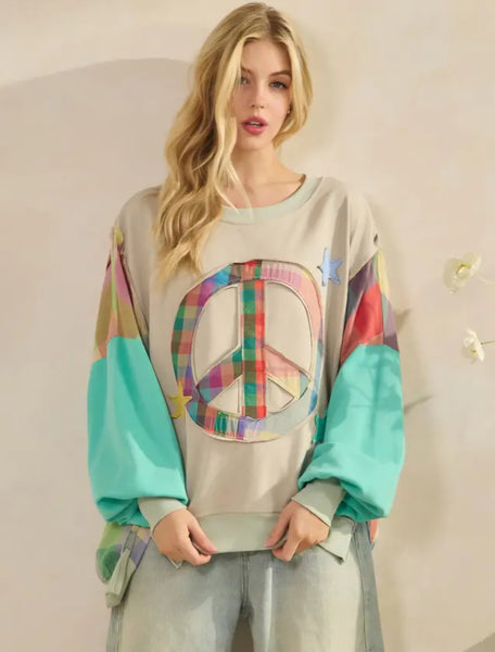 The Patchwork Peace Sweatshirt in Mint features a colorblock design with a plaid inset and a distinctive plaid patchwork peace sign. Its oversized fit and side slits enhance comfort and mobility, making it an ideal choice for casual wear. The unique design elements contribute to a modern aesthetic.
