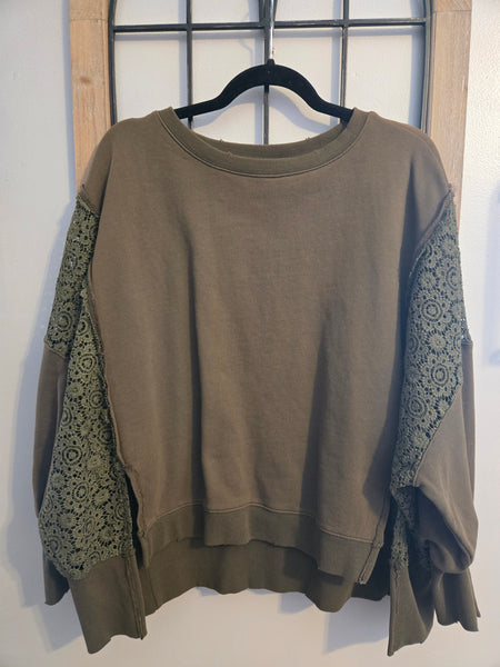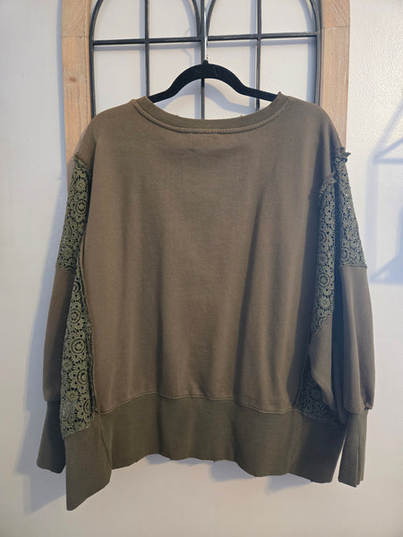 The Olive Oversized Sweatshirt features a relaxed fit with side slits and a high-low hem, enhancing movement and comfort. The lace insets add a touch of sophistication, making it suitable for both casual and slightly dressy settings. This garment combines style with functionality for versatile wear.