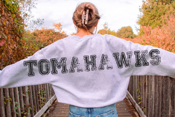 The Battle Ground Tomahawks sweatshirt showcases a prominent oversized "Tomahawks" design on the back, complemented by a vintage graphic in the school's gold and black colors. Constructed from Gildan's unisex fit cotton/poly blend in ash grey, this sweatshirt offers comfort and durability, suitable for showcasing your school spirit.