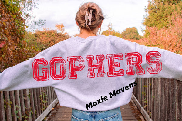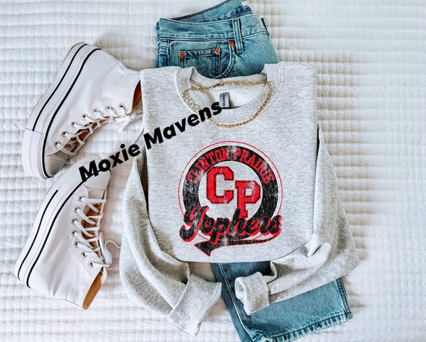 The CP Gophers sweatshirt showcases a prominent oversized "Gophers" design on the back, complemented by a vintage graphic in the school's red and black colors. Constructed from Gildan's unisex fit cotton/poly blend in ash grey, this sweatshirt offers comfort and durability, suitable for showcasing your school spirit.