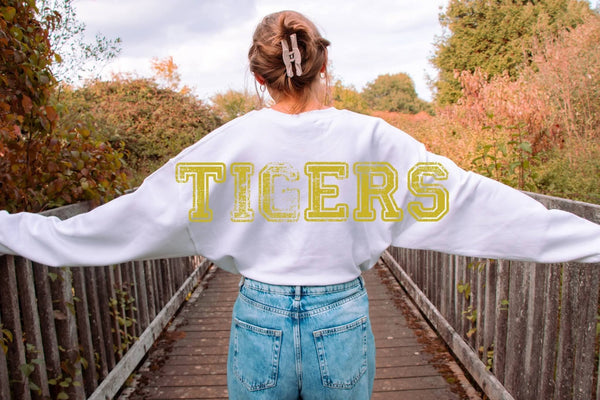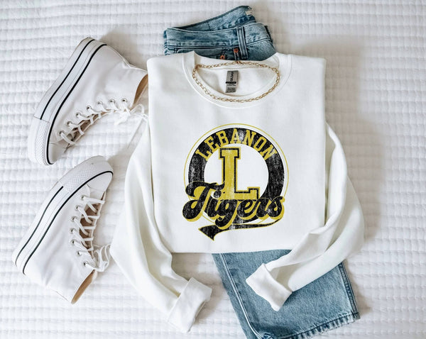 The Lebanon Tigers sweatshirt showcases a prominent oversized "Tigers" design on the back, complemented by a vintage graphic in the school's gold and black colors. Constructed from Gildan's unisex fit cotton/poly blend in white, this sweatshirt offers comfort and durability, suitable for showcasing your school spirit.