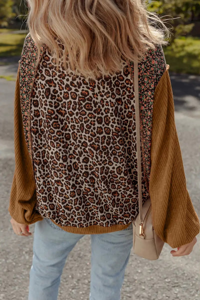 The Leopard Pattern Block Top features a camel ribbed construction with puff sleeves, combining distinct leopard and ditsy floral pattern blocks. The exposed seams enhance structural integrity while providing a unique visual appeal. This design allows for versatility in styling, making it suitable for various occasions.