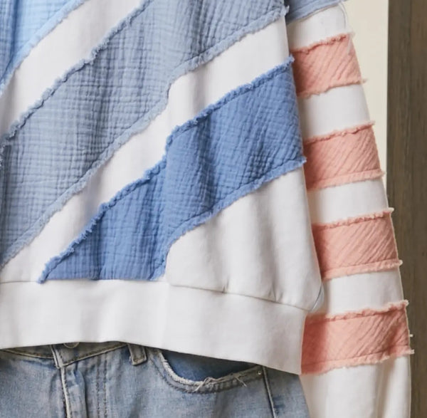 The Spring Stripes Sweatshirt features a textured colorblock design in blue, pink, and mint, providing a visually appealing yet comfortable option for casual wear. The soft crewneck construction ensures comfort, making it suitable for various occasions while maintaining a stylish aesthetic.